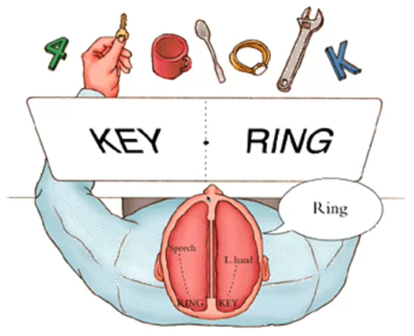 What do you see? (Left brain answers) Ring. But key would be grabbed (right